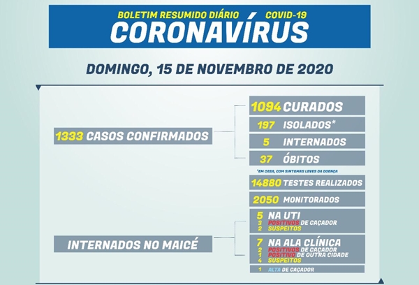 - 1333 casos confirmados: 1094 estão curados; 197 isolados em casa; 5 internados no Maicé