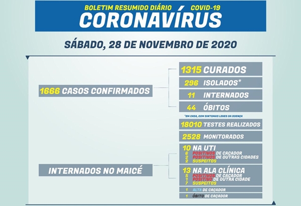 Neste sábado, 28 de novembro, o Setor de Vigilância Epidemiológica de Caçador informou que mais 29 pessoas foram consideradas curadas da Covid-19 no município. No entanto, mais um óbito também foi registrado. Trata-se de uma mulher, de 73 anos.