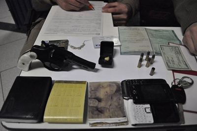 Chegando à delegacia, os Policiais efetuaram revista no interior do veículo, onde foram encontrados documentos de identidade que não eram do acusado, Carteira Nacional de Habilitação (CNH) da proprietária do carro, além de dois talões de cheques sendo um de Bruno Alves Martins e o outro de Hernani Zampertrini, os policiais também acharam vários cartões de crédito de diversos bancos, e também três aparelhos de celular. Com o acusado estava o revolver calibre 32 da marca Rossi com a numeração supostamente remarcada e cinco munições intactas e uma deflagrada e também uma pedra de Crack.