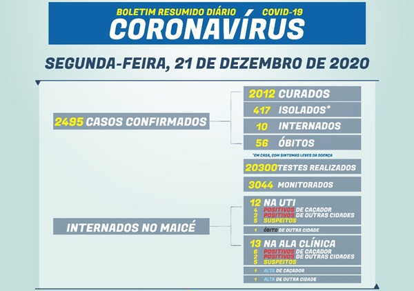 Nesta segunda-feira, 21 de dezembro, Caçador teve mais 20 pacientes curados da Covid-19 e 15 novos casos confirmados.