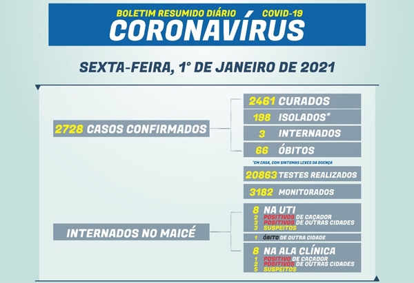 - 2728 casos confirmados: 2461 estão curados; 198 isolados em casa; 3 internados no Maicé