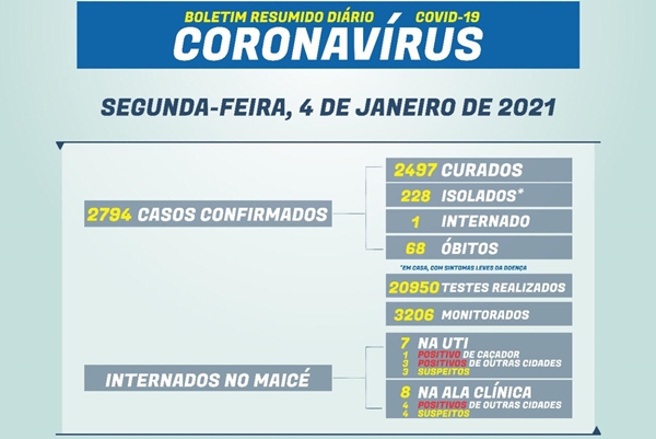 - 2794 casos confirmados: 2497 estão curados; 228 isolados em casa; 1 internado no Maicé