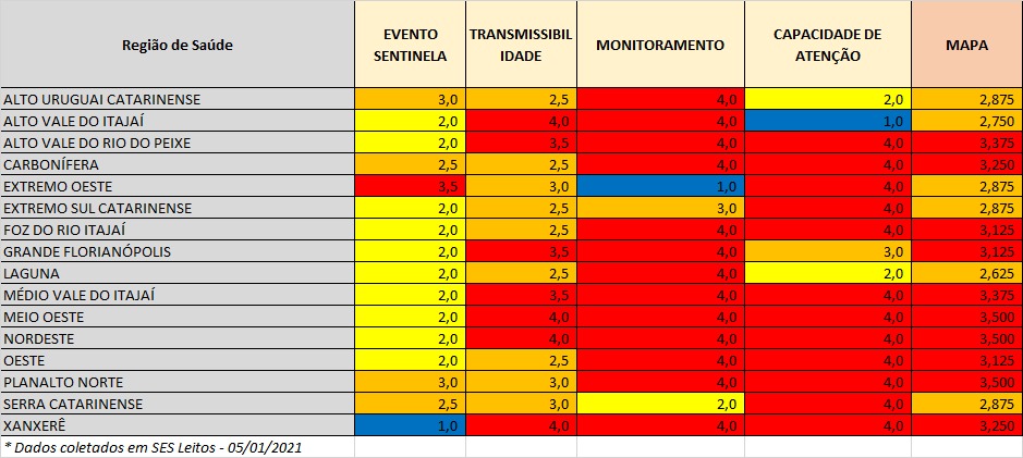 As regiões de Alto Uruguai Catarinense, Alto Vale do Itajaí, Extremo Oeste, Extremo Sul, Laguna e Serra foram reclassificadas do nível gravíssimo para o grave (cor laranja). Já as regiões de Xanxerê, Grande Florianópolis, Médio Vale do Itajaí e Oeste tiveram piora na situação. Elas estavam na cor laranja na semana passada e sofreram agravamento no índice desta semana, sendo classificadas como nível gravíssimo (vermelho).