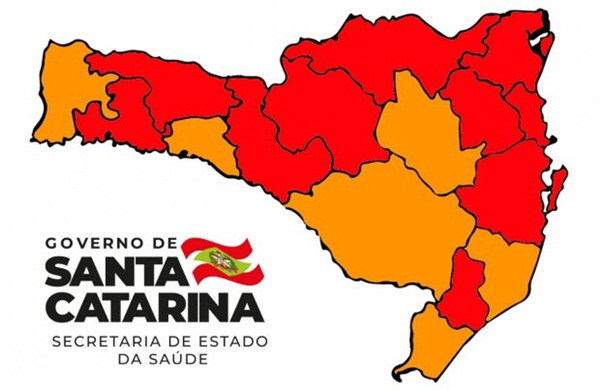 O novo mapa de risco de contaminação por coronavírus mostra 10 das 16 regiões de Santa Catarina em nível gravíssimo, identificado pela cor vermelha. As outras seis regiões estão em nível grave, classificado pela cor laranja. São duas regiões a menos na definição mais crítica do que o registrado há uma semana. No último boletim, o Estado tinha 12 das 16 regiões em condição gravíssima para a covid-19.