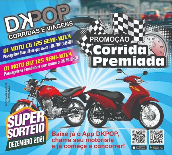 ATENÇÃO, fazendo parte das comemorações do seu aniversário, a DKPOP lança o sorteio de duas Motos para todos os seus clientes. Baixe agora mesmo o aplicativo e participe você também.