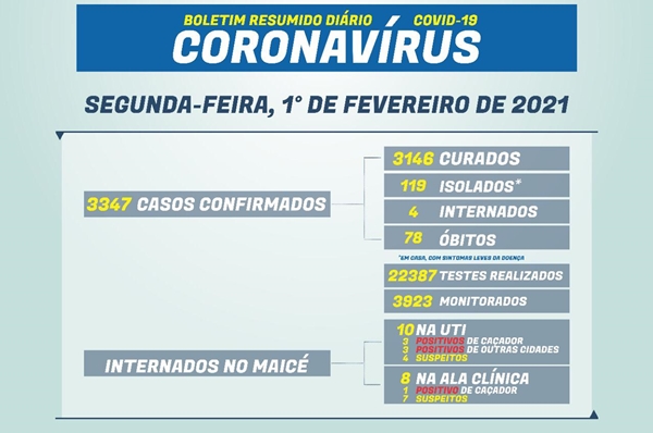 Caçador teve nesta segunda-feira, 1º de fevereiro, o maior número de pessoas curadas da Covid-19, desde o início da pandemia. Somente nas últimas 24 horas, 91 pacientes que estavam com diagnóstico positivo para a infecção, entraram para o quadro de curados. Além disso, o município tem agora, somente 123 casos ativos da doença. Veja mais detalhes no boletim a seguir: