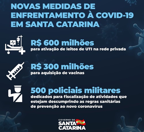 O governador Carlos Moisés anunciou o aumento na fiscalização e recursos para, em parceria com gestores municipais, conter o avanço da Covid-19 em Santa Catarina. Em reunião com prefeitos, representantes de Poderes e o secretário de Estado da Saúde, André Motta Ribeiro, o governador confirmou que o Estado dispõe de R$ 600 milhões para ativação de leitos de UTI na rede privada, R$ 300 milhões para aquisição de vacinas e que um efetivo de 500 policiais militares atuará, exclusivamente, na fiscalização de atividades que estejam descumprindo os protocolos sanitários de prevenção ao novo coronavírus.