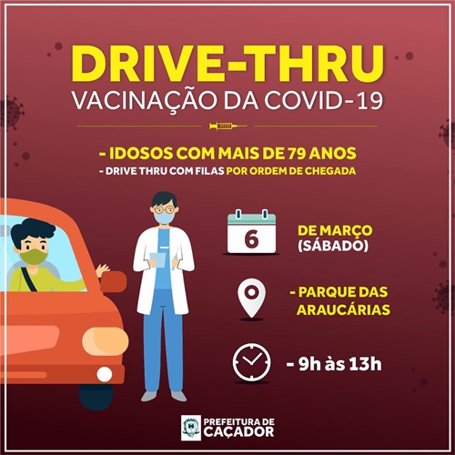 A Prefeitura de Caçador realiza, neste sábado, 6 de março, mais um drive thru para vacinação de idosos, agora com mais de 79 anos. A imunização será realizada novamente no Parque das Araucárias, das 9h às 13h e estarão disponíveis doses que sobraram do lote destinado aos profissionais de Saúde com mais de 50 anos.