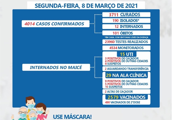 Nesta segunda-feira, 8 de março, Caçador ultrapassou a marca de 100 óbitos causados pela Covid-19. Somente neste dia foram registrados 7 mortes. Dentre eles, 4 estavam em Caçador e 3 em outras cidades. Estes de fora eram suspeitos e faleceram em outras datas, mas tiveram seus exames divulgados apenas nesta segunda-feira.