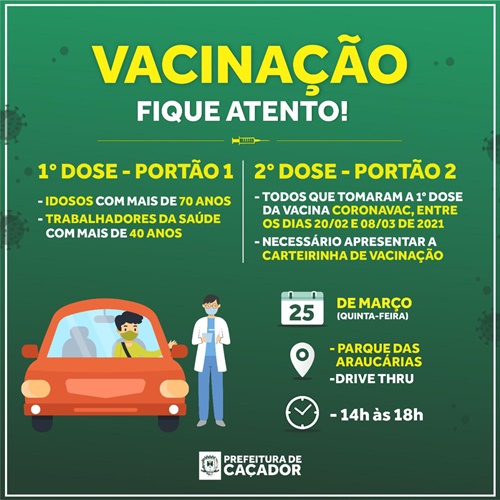Todos que receberam a 1ª dose da vacina Coronavac (Instituto Butatan), entre os dias 20 de fevereiro de 2021 e 8 de março de 2021: Compareçam ao Parque das Araucárias, nesta quinta-feira, 25 de março, para receber a segunda dose da vacina, NO PORTÃO 2.