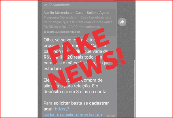 Está circulando em grupos de WhatsApp uma mensagem sobre o Programa Merenda em Casa, em que a Secretaria de Educação estaria realizando um cadastro para receber um auxílio em dinheiro. Trata-se de uma informação falsa.