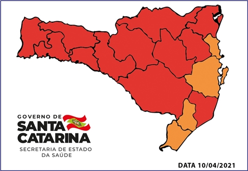 A Matriz de Risco Potencial divulgada neste sábado, 10 de abril, pelo governo de Santa Catarina, classifica 12 das 16 regiões em alerta gravíssimo (cor vermelha) e quatro em risco grave (cor laranja) para transmissão do novo coronavírus.