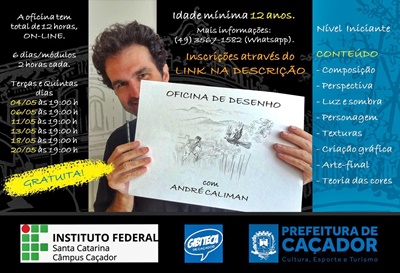 A Gibiteca de Caçador, por meio da Secretaria de Cultura, Esporte e Turismo, com apoio do Instituto Federal de Santa Catarina (IFSC), lança Oficina de Desenho on-line, com o total de 12 horas. O evento será ministrado pelo Ilustrador, escritor e quadrinista, André Caliman.