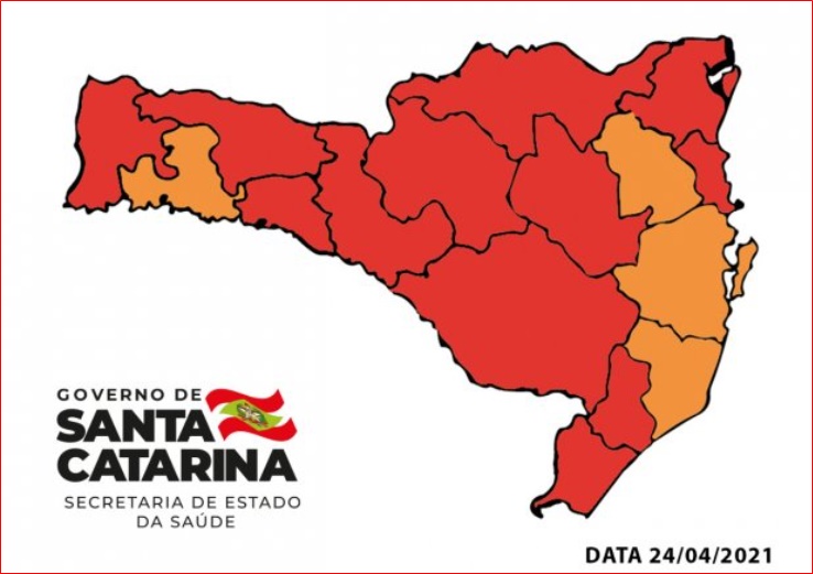 Grande Florianópolis, Laguna, Médio Vale do Itajaí e Oeste foram reclassificados para o nível grave (cor laranja). A última matriz, divulgada no dia 17, apontava todas as regiões com risco gravíssimo (cor vermelha).