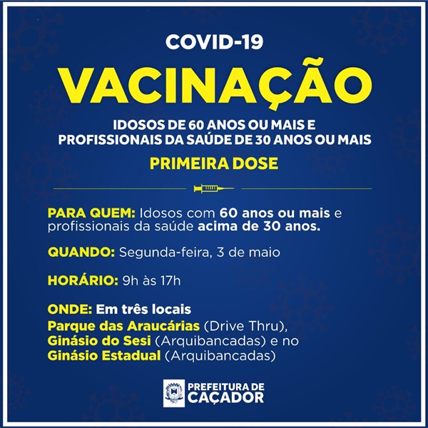 A vacinação acontece das 9h às 17h, nos três locais tradicionais: Parque das Araucárias (EXCLUSIVAMENTE drive thru); Ginásio do Sesi (arquibancadas); Ginásio Estadual (arquibancadas).