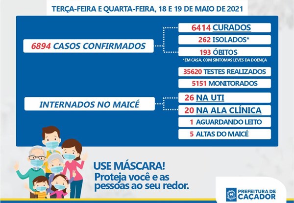 Nesta terça e quarta-feira, 18 e 19 de maio, Caçador registrou mais sete óbitos causados pela Covid-19. O total de mortes agora é de 193. Neste mesmo período de 48 horas, também foram contabilizados mais 115 novos casos, elevando o total de registros no município para 6894.