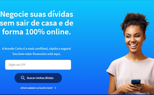 Para iniciar o processo de negociação, o primeiro passo é criar um cadastro na Acordo Certo com CPF, data de nascimento, e-mail e número de telefone celular. Na etapa seguinte, é iniciada a negociação, com acordos personalizados para atender a necessidade de cada pessoa, com opções de pagamento de faturas vencidas à vista e parcelamentos em até 60 vezes para casos específicos, ou o reparcelamento de uma negociação realizada anteriormente.