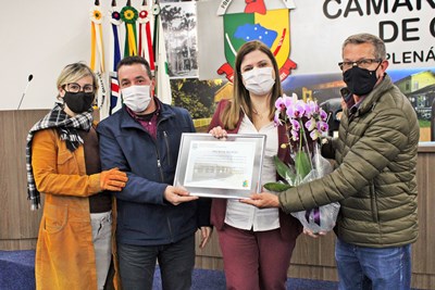 Ao final, o presidente Moacir D’Agostini e os vereadores Itacir Fiorese e Lidiane Cattani entregaram uma placa em nome do Poder Legislativo, como reconhecimento pelos relevantes serviços prestados pelo IFSC em Caçador e na região.