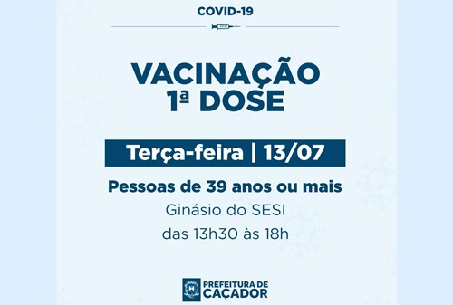 A Prefeitura de Caçador realiza, nesta terça-feira, 13 de julho, vacinação contra Covid-19 para pessoas com 39 anos ou mais.