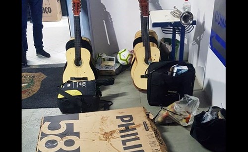 Dentro da mata os policiais encontraram e recuperaram os seguintes objetos: uma televisão de 58 polegadas, dez violões, dois retroprojetores, um aparelho de som, quatro bolas de futebol, 19 bolas de tênis, materiais escolares, um pedestal, um trompete, um refletor e dois microfones.