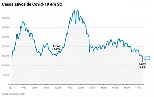 O boletim diário da Covid-19 de sábado, 24 de julho, trouxe a informação de que há 14.821 casos ativos em Santa Catarina. É o menor número já registrado em 2021, abaixo dos 14.899 do dia 17 de fevereiro, que era o mais baixo até então.