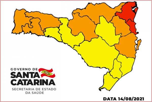 As regiões do Alto Vale do Rio do Peixe, Extremo Oeste, Grande Florianópolis, Médio Vale do Itajaí, Oeste, Planalto Norte e Xanxerê foram classificadas com o risco Grave (cor laranja). Outras sete regiões estão classificadas com o Risco Alto (cor amarela): Alto Uruguai Catarinense, Alto Vale do Itajaí, Carbonífera, Extremo Sul, Laguna, Meio Oeste e Serra Catarinense.