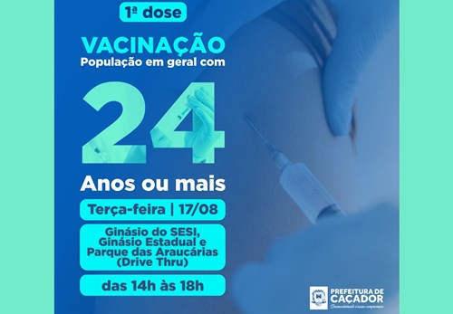A nova etapa da vacinação contra a Covid-19, para a população em geral, com 24 anos ou mais, acontece nesta terça-feira, 17 de agosto, das 14h às 18h.