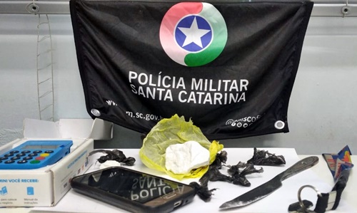 Ainda da residência também foi apreendido um celular Samsung, uma faca e embalagens plásticas, bem como uma máquina de Cartão, que segundo o suspeito, era utilizada para realizar cobranças da venda de drogas.