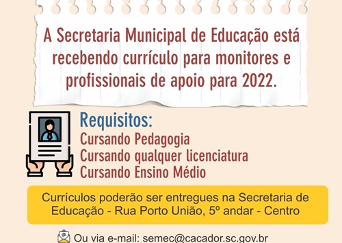 Os interessados devem enviar o currículo através do e-mail: semec@cacador.sc.gov.br ou entregar presencialmente, a partir do dia 17 de janeiro, na Secretaria de Educação (Rua Porto União, 5° andar - Centro).