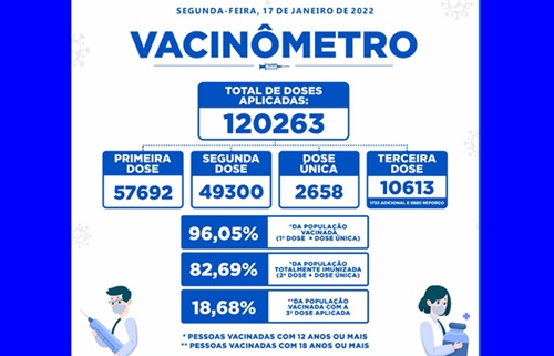 Foram aplicadas mais de 120 mil doses, entre primeiras, segundas, terceiras e doses únicas. Deste total, 96,05% são de primeiras doses; 82,69% de segundas doses e, 18,68% de terceiras doses.