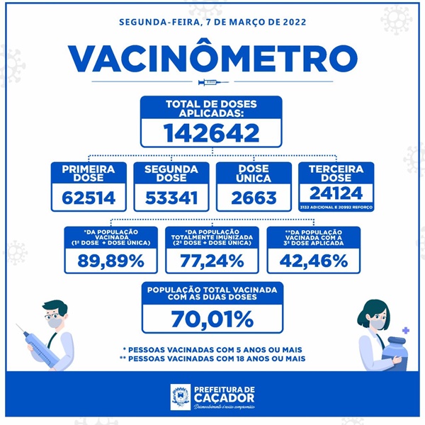 “Se levarmos em consideração o que sempre foi dito, que a Pandemia estaria controlada quando 70% da população estivesse imunizada, e que a imunização acontece após a segunda dose, podemos afirmar que estávamos muito próximos de atingir esse percentual. Agora, ultrapassamos o número chave. Foram aplicadas as doses suficientes para que 70% da população total (não apenas a população vacinável) estejam nessa categoria de "totalmente imunizada”, destacou o vice-prefeito, Alencar Mendes.