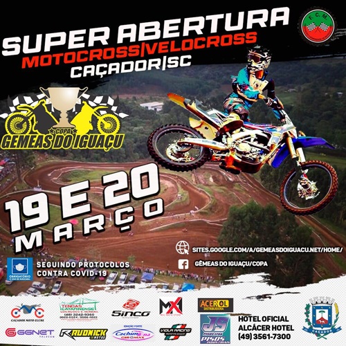Caçador irá sediar, neste fim de semana, a Abertura da Copa Gêmeas do Iguaçu, de motocross e velocross. A competição inicia neste sábado, 19, com treinos livres a partir das 13h, seguindo no domingo, 20, com mais uma sessão de treinos às 8h e às 10h30, o início das competições, na sede do Caçador Moto Clube.