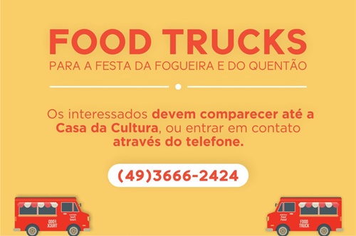 A Prefeitura de Caçador, através da Secretaria de Cultura, Esporte e Turismo, abre a inscrição para Food Trucks, que desejam comercializar na Festa da Fogueira e do Quentão, que acontecerá no dia 25 de Junho, no Parque Central.