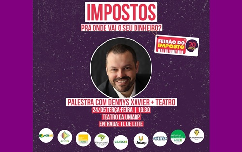 O Núcleo de Jovens Empreendedores da ACIC de Caçador promove nesta terça-feira (24) às 19h30 no Teatro da Uniarp uma palestra com Dennys Xavier com o tema “Imposto – Para onde vai o seu dinheiro?”, fazendo parte das ações do Feirão do Imposto, que acontece em território nacional todo mês de maio. O ingresso será um litro de leite a ser doado posteriormente para uma entidade.