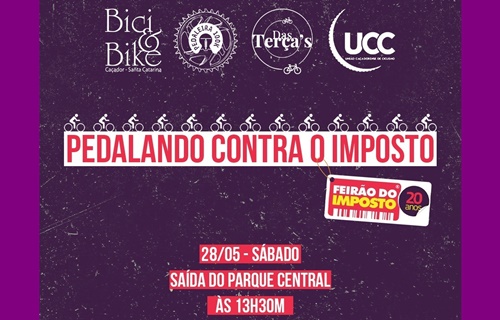 Já no dia 28 de maio, próximo sábado, outra ação será realizada saindo do Parque Central às 13h30. O evento denominado “Pedalando contra o Imposto”, será um passeio ciclístico que irá percorrer ruas de Caçador como forma de conscientizar as pessoas também sobre o excesso de cargas tributárias sobre produtos, com foco no alto preço dos combustíveis e tributos sobre a compra de bicicletas.