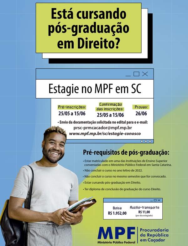 A Procuradoria da República (MPF) em Caçador está com inscrições abertas para estágio de pós-graduação em Direito. As inscrições, o edital e demais informações podem ser acessadas através do link http://www.mpf.mp.br/sc/estagie-conosco/