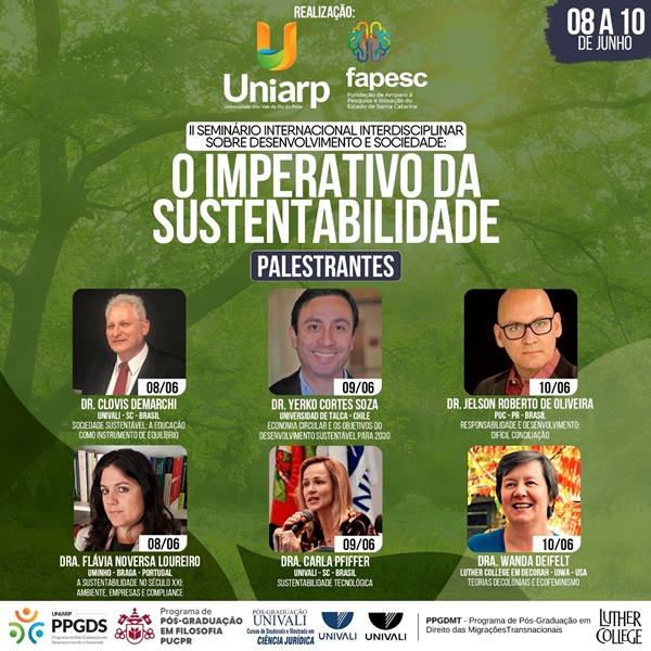 Dia 09 de junho, o evento terá palestra com Dr. Yerko Cortes Soza, da Universidade de Talca, do Chile. Ele vai falar sobre economia circular e os objetivos do desenvolvimento sustentável para 2030. Dia 09 de junho, o evento prossegue com palestra da Dra. Carla Pfiffer, da UNIVALI, sobre sustentabilidade tecnológica.