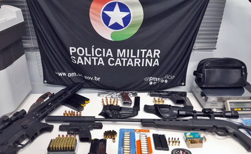 Com eles, os policiais militares apreenderam três pistolas, sendo duas calibre 9 mm e uma .45, além de duas carabinas .22 e 9 mm. Também foram recolhidas várias munições.