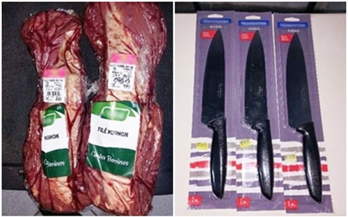 A abordagem do suspeito ocorreu na rua Irmão Tomaz, bairro Bom Jesus, onde ele foi flagrado de posse de duas peças de carne filé mignon e três facas de cozinha novas lacradas, cujos produtos foram furtados de um supermercado e de uma loja.