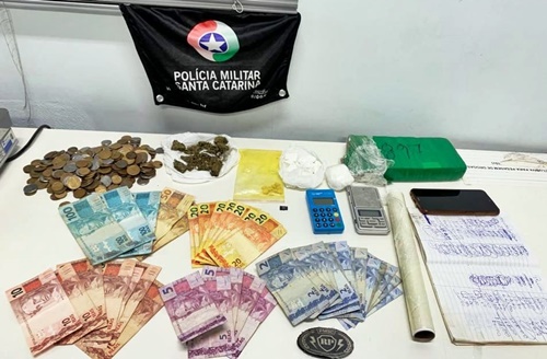 Os policiais militares apreenderam cerca de 790g de maconha, 95g de cocaína, nove comprimidos de ecstasy, três balanças de precisão e um caderno contendo anotações de devedores.