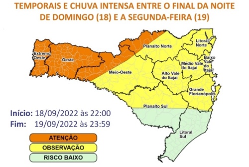 A Defesa Ckivil alerta para o risto chuva forte e granizo em pontos isolados das regiões oeste e meio-oeste de Santa Catarina nesta segunda-feira, dia 19 de setembro.