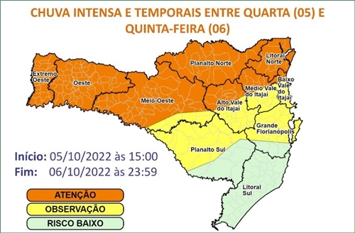 Conforme a Defesa Civil, as áreas com maior risco são o Extremo-Oeste, Meio-Oeste, Oeste, Planalto e Litoral Norte catarinense (conforme imagens do mapa).