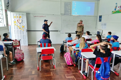 Dois minutos e meio. Esse foi o tempo que os alunos do programa Estudante Cidadão da Polícia Militar levaram para sair da escola Henrique Júlio Berger durante uma simulação de incêndio realizada nesta segunda-feira, 17. A ação contou com a participação dos Bombeiros Militares de Caçador.