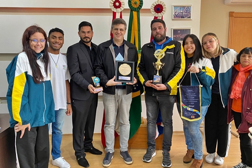 Integrantes das duas fanfarras estiveram na prefeitura apresentando seus títulos ao prefeito Alencar Mendes