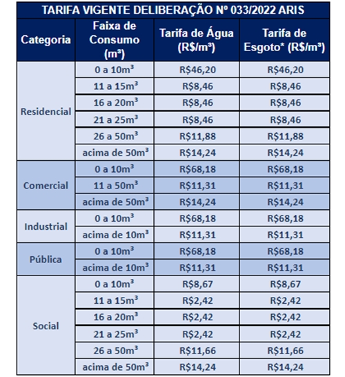 A tarifa de esgoto equivale a 100% da tarifa da água cobrada. *