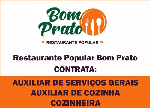 O Restaurante Popular Bom Prato está contratando auxiliar de serviços gerais e cozinha, e cozinheira. Os interessados devem levar o currículo no local, das 7h às 16h.