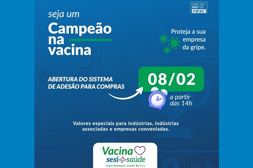 O SESI, entidade da FIESC, deu início nesta quarta-feira (8) à campanha de vacinação contra a gripe. A abertura do sistema para adesão das indústrias ocorreu às 14 horas. Nele, as empresas podem indicar o interesse em imunizar seus trabalhadores, o tipo de vacina - trivalente e quadrivalente -, além da quantidade de doses necessárias. Ao todo, 295 mil doses estão disponíveis e a aplicação ocorrerá a partir de março.