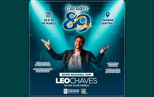 O show nacional do cantor Léo Chaves (ex dupla Victor e Leo), acontece neste sábado, 25 de março, a partir das 22h, no Parque Central. Além disso, neste sábado, às 14h, começam os shows dos artistas locais, iniciando com a banda gospel UMADCA.