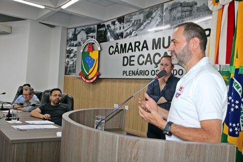 O presidente da Caçadorense, Denilson Araújo, e o diretor de futebol do clube, Gustavo Basquera Menzel, fizeram uso da palavra livre durante sessão ordinária desta terça-feira (4) na Câmara Municipal de Caçador, para pedir o apoio dos vereadores para a resoluções de problemas relacionados ao estádio municipal Salézio Kindermann.