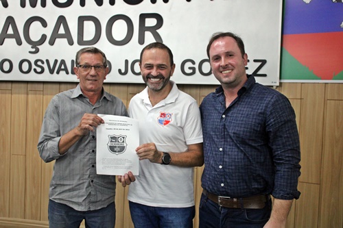 Eles vieram a convite dos vereadores Johny Marcos e Marcio JF e, durante a explanação, entregaram ao presidente do Legislativo, Itacir Fiorese (Fically), um protocolo de intenções para a busca de recursos junto à Câmara visando à execução do projeto de iluminação do estádio, permitindo que a Caçadorense possa receber jogos do Catarinense da série B no período no turno.
